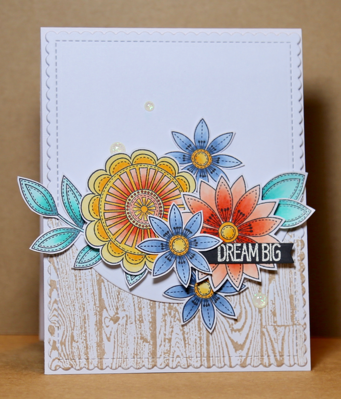 I created a portrait card instead of landscape and added a whole load of Copic coloured blooms from Funky Flowers. The base of the card has been stamped with the Wood Plank Background which will probably turn up on the next 10 cards. Since there was 30% off I could justify buying another Blueprints set of dies - Blueprints 27. I've used the scallop frame from this set for the base and the sentiment's from Adorable Elephants.